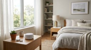 スマホやゲーム機は寝室から遠ざけ、夜は間接照明のようなやわらかい光に切り替えると入眠しやすくなります。