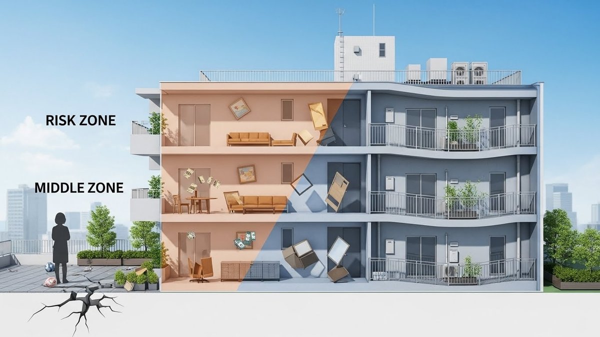 中間階は上下の床や壁に囲まれているため、地震時の応力が分散されやすく、構造的に安定しやすい傾向があります。上層と下層の両方が支え合うことで、局所的な損傷が起きにくいことが理由です。そのため多くのケースで中間階は比較的安全とされます。
