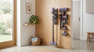 次に、本体のサイズだけでなく、アタッチメント類をまとめて収納できるかもチェックしましょう。布団専用ノズルや隙間ノズルがバラバラに散らばってしまうと、いざ使いたい時に探す手間が発生します。スタンドにすべてのアタッチメントをセットできるタイプは、機能的で非常に便利です。
