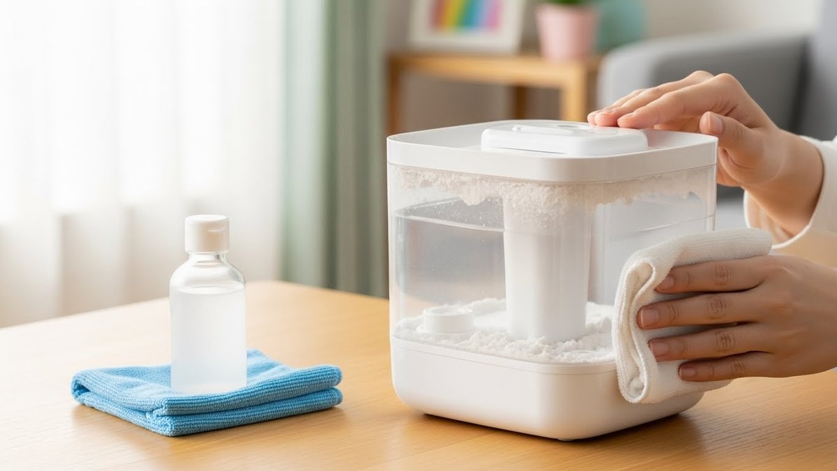 使用後や給水のたびにタンクの内外を柔らかい布でさっと拭き、残水をためない習慣をつけます。噴霧口周辺や本体の上面も拭き取ることでミネラルの蓄積やカビの発生を抑えられます。拭き掃除は1分程度で済むため、習慣化しやすい対策です。