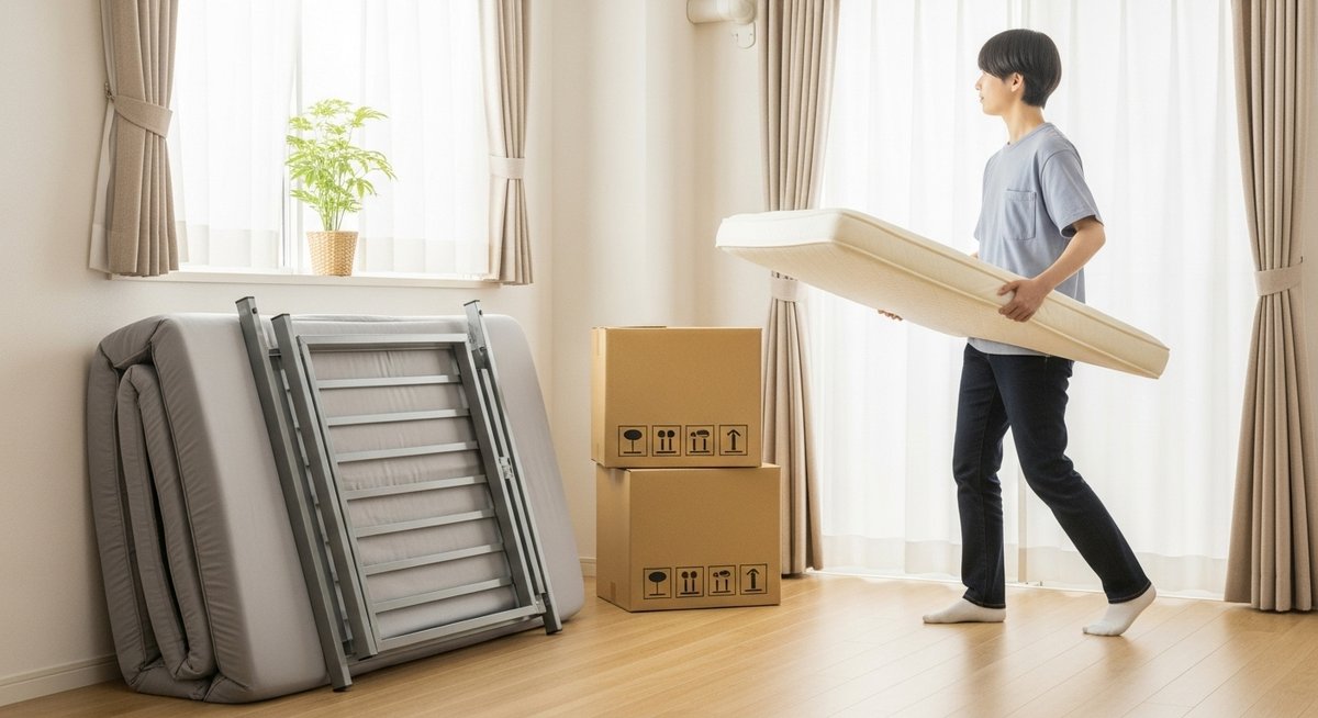 三つ折りマットレスは軽量で折りたたんで運べるため、転勤族に人気があります。畳めば玄関や車に収まりやすく、搬入経路が狭い物件でも扱いやすい点が魅力です。収納スペースに入れて普段は置き場所を節約できます。