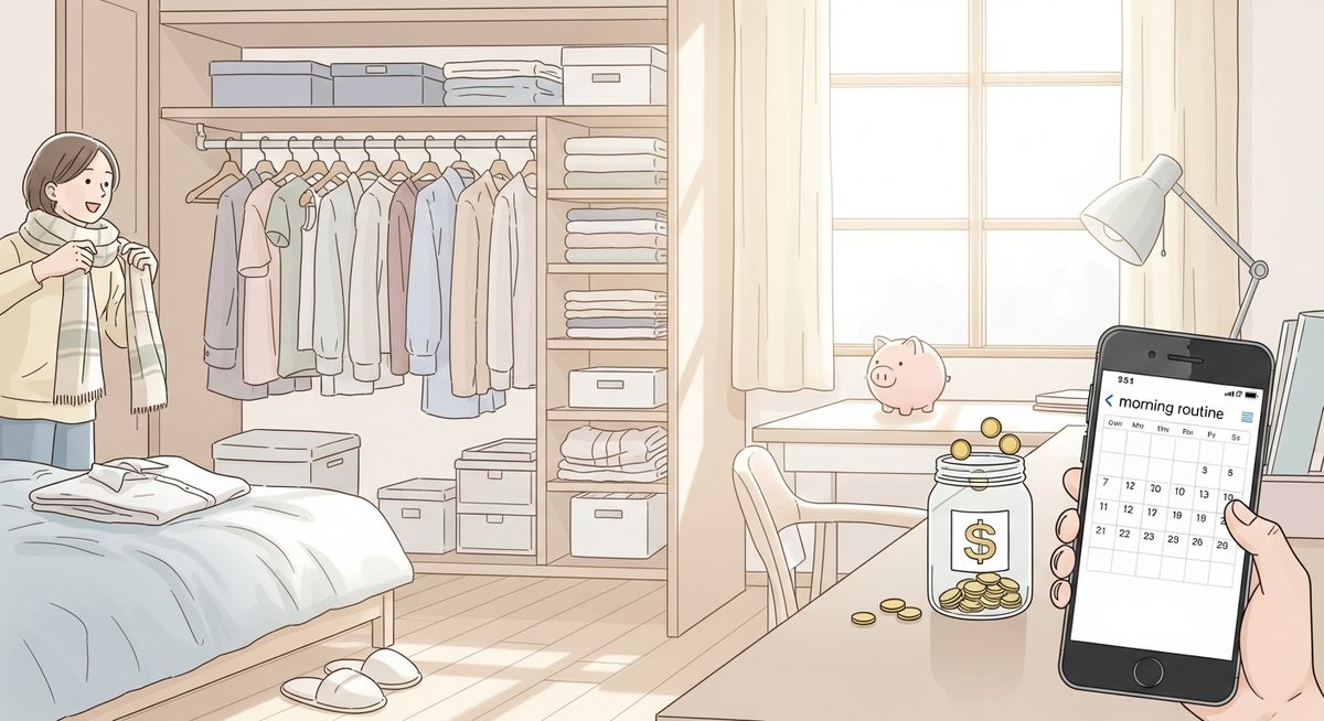 服を買わなくなるとワードローブが整理され、手持ちのアイテムでコーデを組みやすくなります。着回ししやすい定番アイテムだけが残ることで、毎朝の服選びにかける時間が短縮されます。結果として出勤や外出前の準備がスムーズになります。